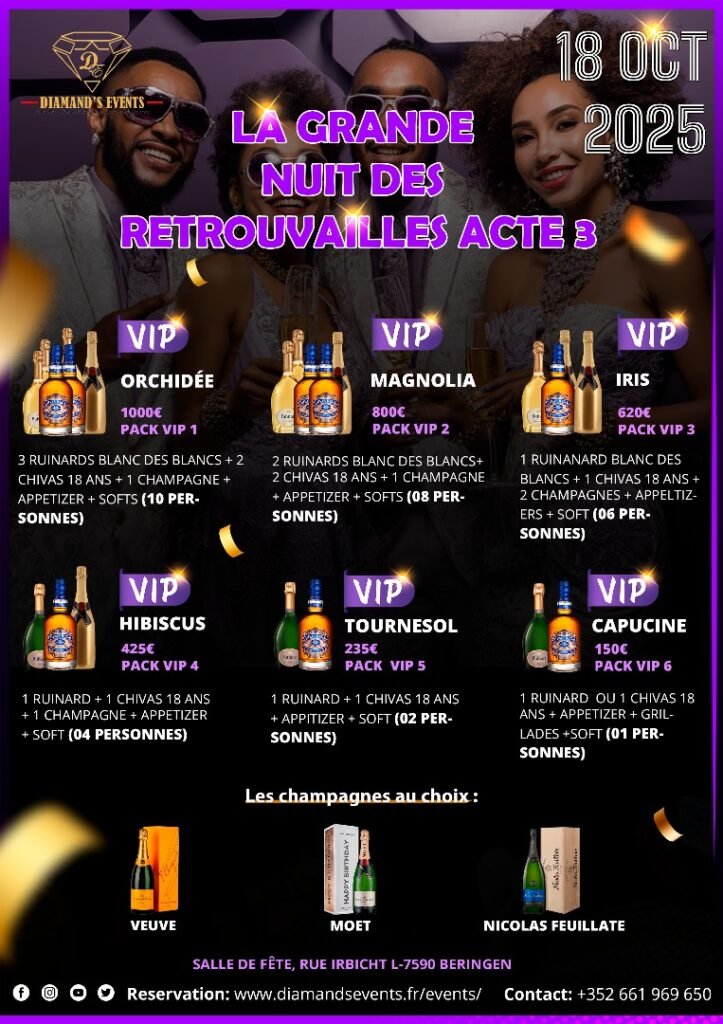 Fidèle à sa vision, Diamand´s Events vous invite une fois de plus à une soirée de retrouvailles riche en sensation et en émotion. Dans un cadre glamoureux, laissez vous choyer par nos soins. Faites votre réservation dès maintenant!